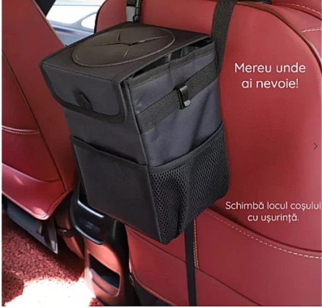 Coșul poate fi atașat rapid și ușor în diverse locații din mașină, fie că este vorba de spatele scaunului, consola centrală sau în alt loc convenabil.