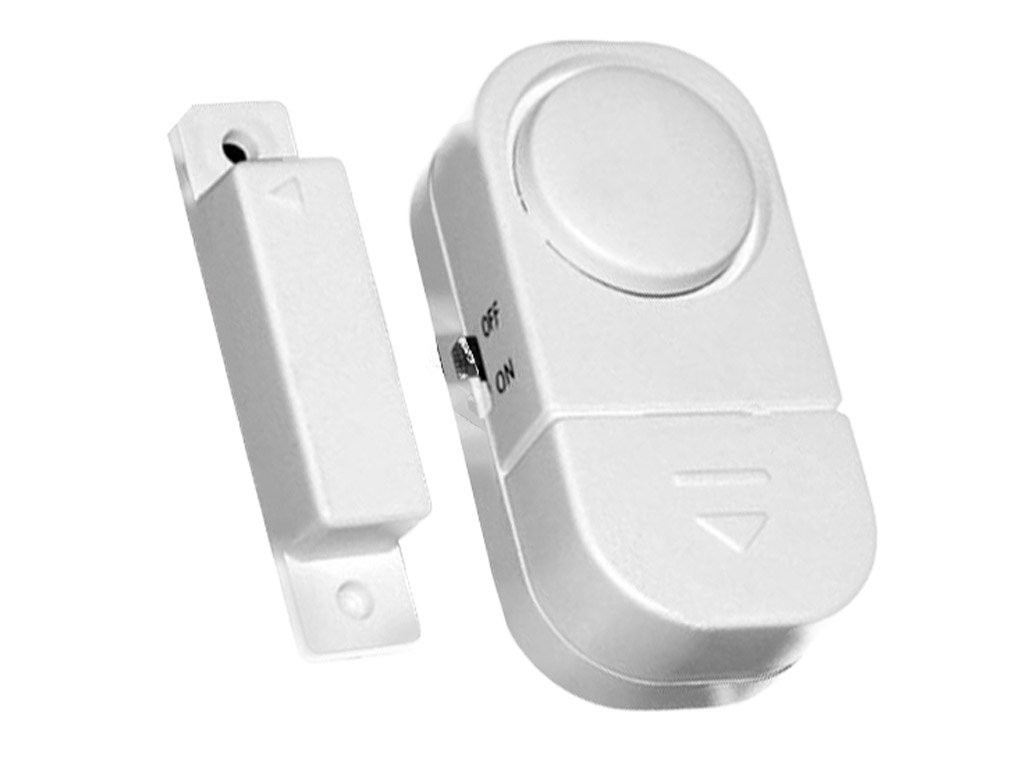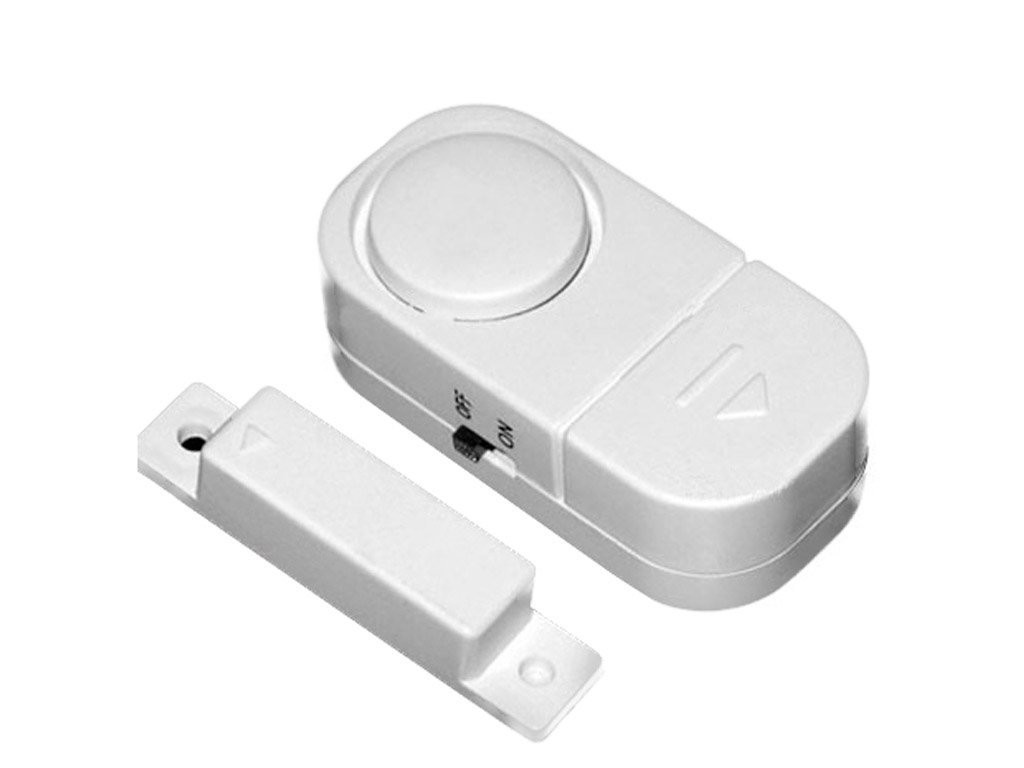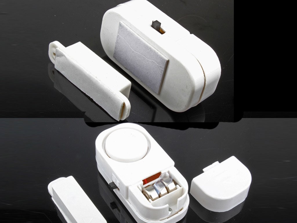 Alarmă pentru ușă și fereastră fără fir practică și comodă care funcționează prin magnetism si se compune din două părți cu magneți, care sunt separate atunci când se deschide ușa sau fereastra.
