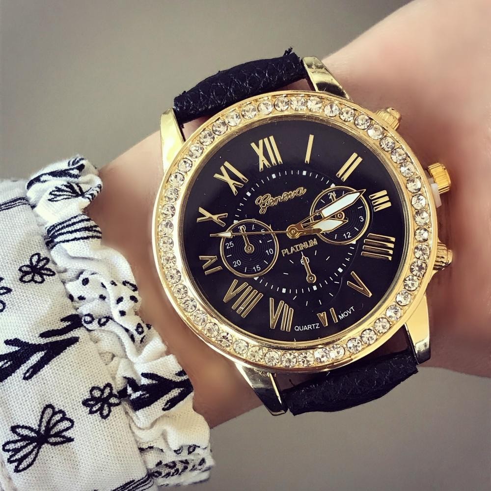 Ceas dama Golden Black Roman cu pietricele curea piele PU