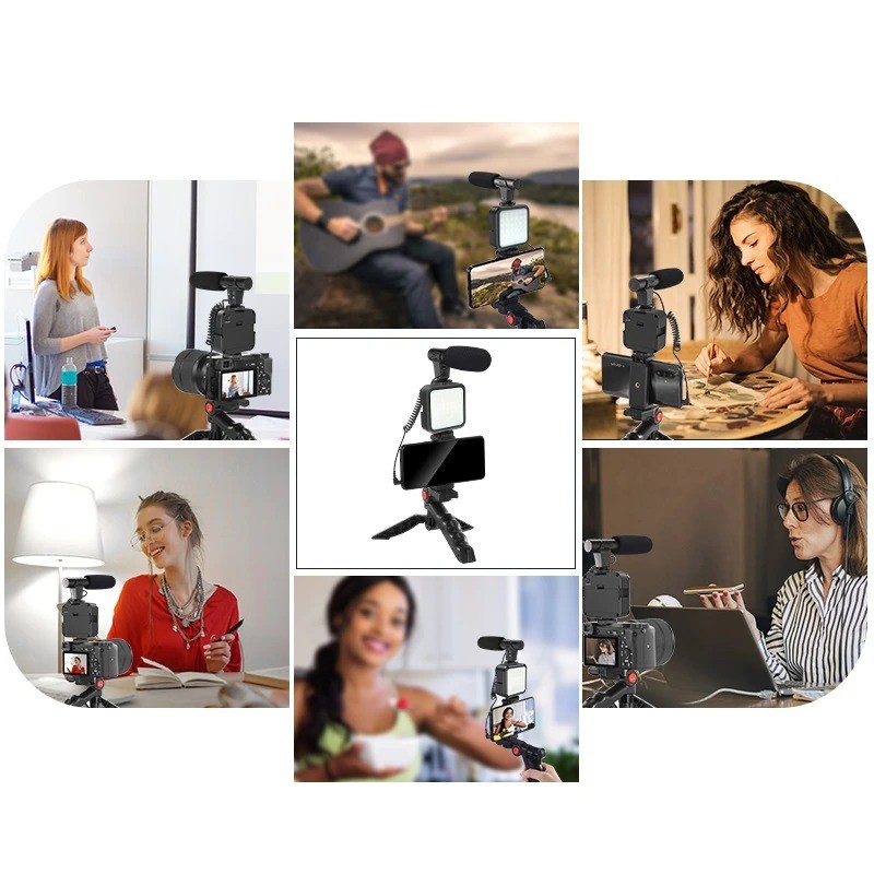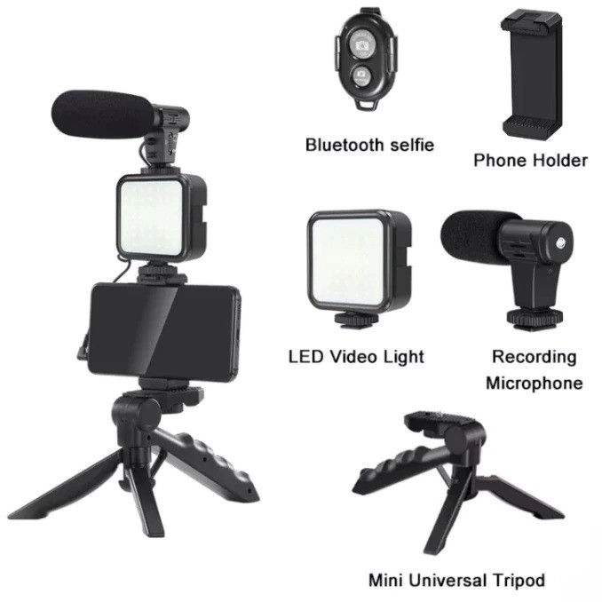 Kit de vlogging pentru smartphone, trepied, microfon, panou LED, telecomanda bluetooth, suport reglabil telefon