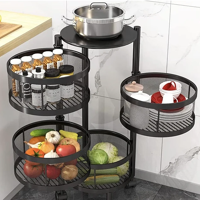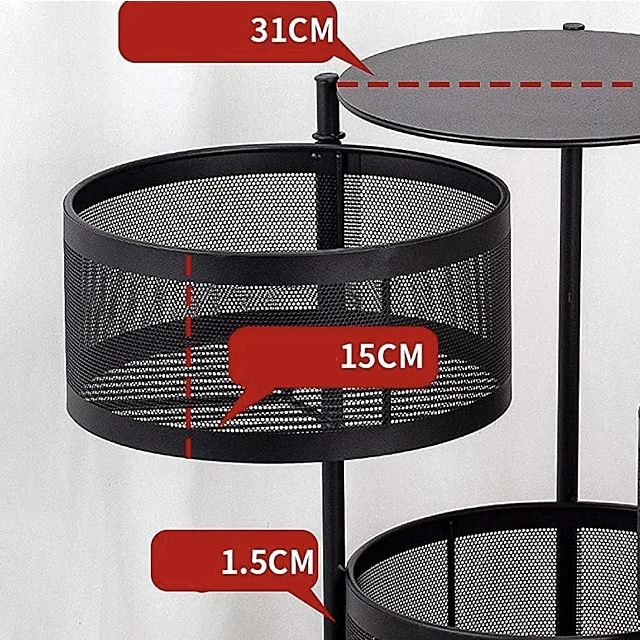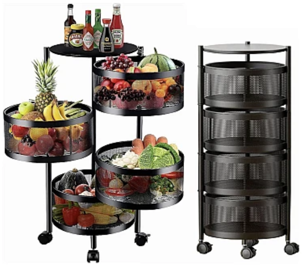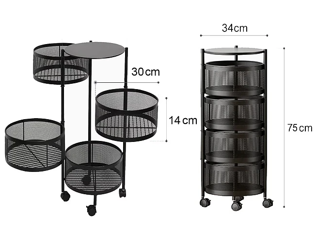 Construcția sa rotativă și mobilitatea datorită roților permit un acces facil la toate obiectele depozitate. Cele cinci coșuri metalice spațioase oferă suficient loc pentru depozitarea alimentelor, produselor cosmetice, obiectelor mărunte sau rechizitelor de birou.