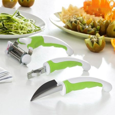 Perfecte pentru prepararea garniturilor si decorarea celor mai bune creatii culinare. Permit taierea in rondele, felii si curatarea legumelor si a fructelor. Setul de decorat nu poate lipsi din cele mai selecte si creative bucatarii!Specificatii: