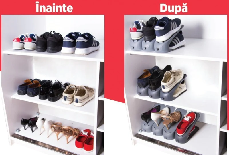 Avantajul lor e ca fiecare suport poate fi reglat la inaltimea dorita, astfel incat sa poata sustine toti pantofii indiferent de constitutia lor “corporala”. Setul este prevazut si cu suprafata antiderapanta care nu le vor mai permite sa lunece si sa-ti activeze pofta de shoppng atunci cand vor ei.