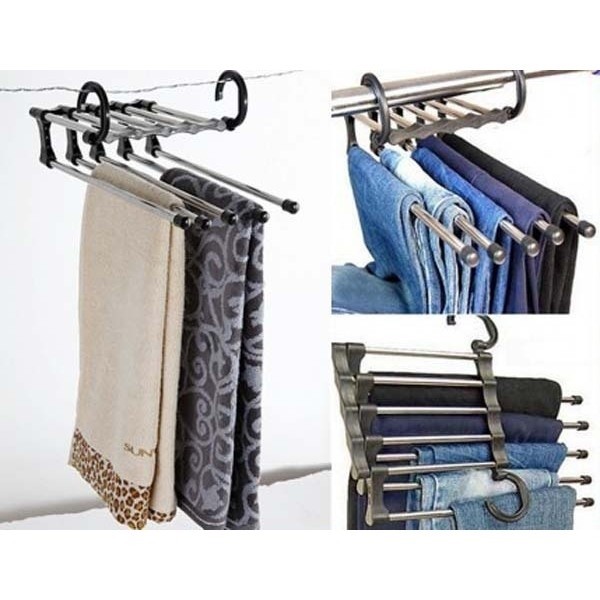 Un cuier practic pentru 5 perechi de pantaloni care pot fi ușor atașați de orice dulap.