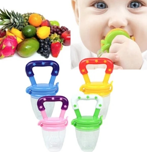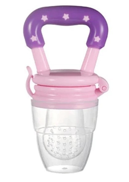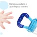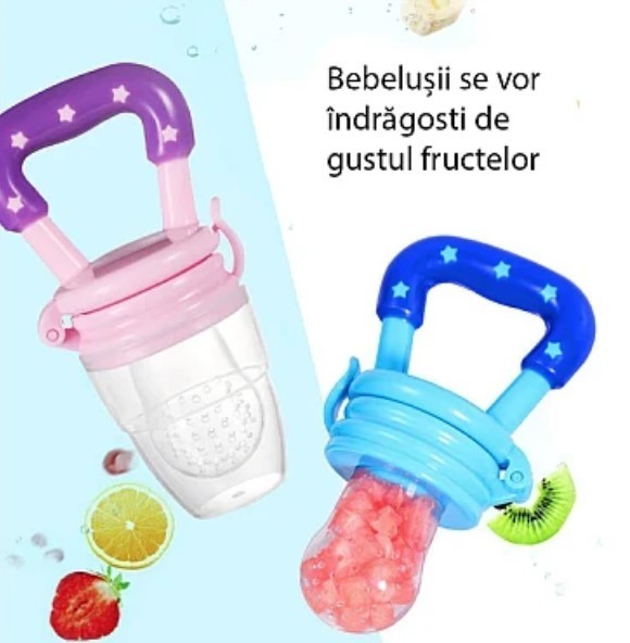 Compartiment pentru fructe: Suzeta are un compartiment sau o cameră specială în care puteți introduce bucăți mici de fructe reci sau congelate, cum ar fi banane, mere sau căpșuni. Aceasta permite copilului să mestece fructul și să obțină confort pentru gingiile lor.