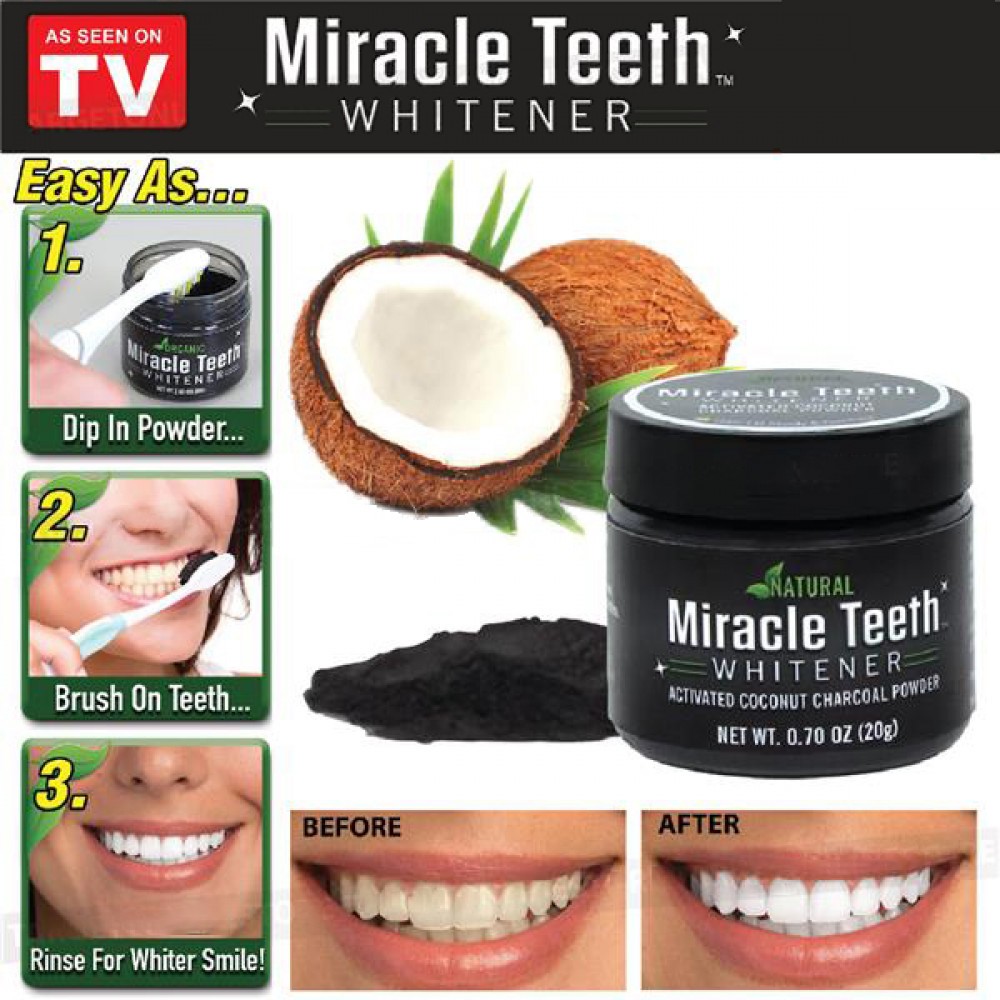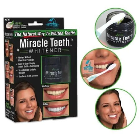 Tratamentul pentru albirea dintilor utilizeaza ingrediente naturale avand in compozitie carbune natural activ, nuca de cocos, pulbere de bentonita si ulei de seminte de portocale care extrage si elimina ingalbenirea si petele. Tratamentul este complet natural si bland cu dintii sau gingiile.